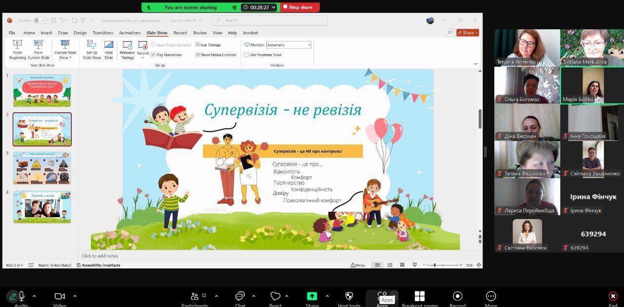 У межах міжнародного проєкту «Стійкі вчителі, стійкі діти», що реалізується Агентством розвитку освітньої політики, після завершення літнього циклу тренінгів було впроваджено етап супервізійної підтримки для учасників першої та другої навчальних груп. Супервізійні зустрічі відбулися 14 вересня 2025 року та стали логічним продовженням навчального процесу, спрямованим на забезпечення якості та сталості впровадження програми в освітніх громадах.